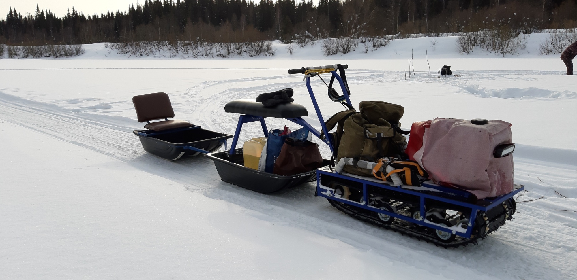 - Лучшая проходимость при своих габаритах благодаря тому, что вес водителя распределен между санями и буксировщиком;