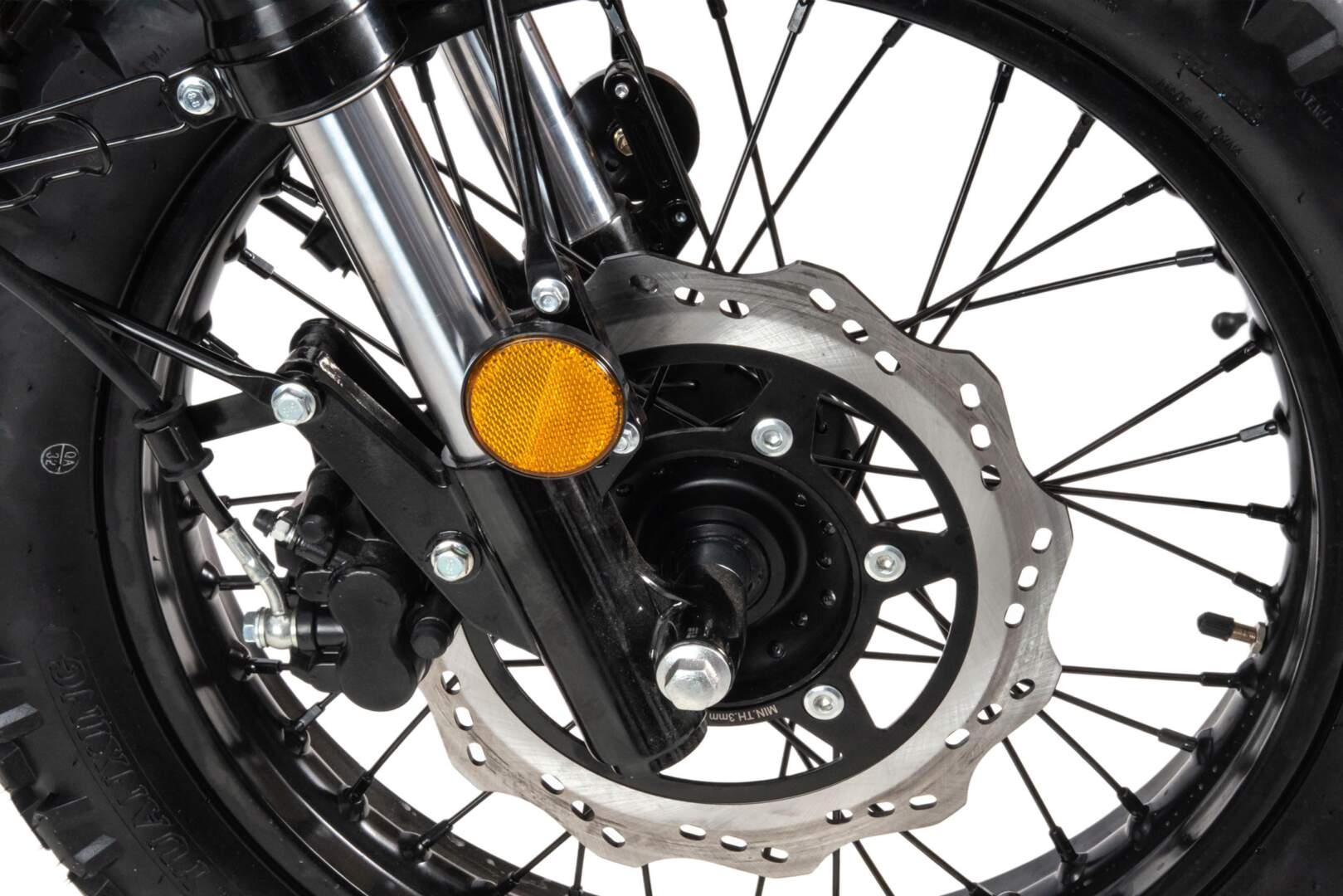 Передний увеличенный тормозной диск в сочетании с качественной тормозной системой позволяет максимально уменьшить тормозной путь.