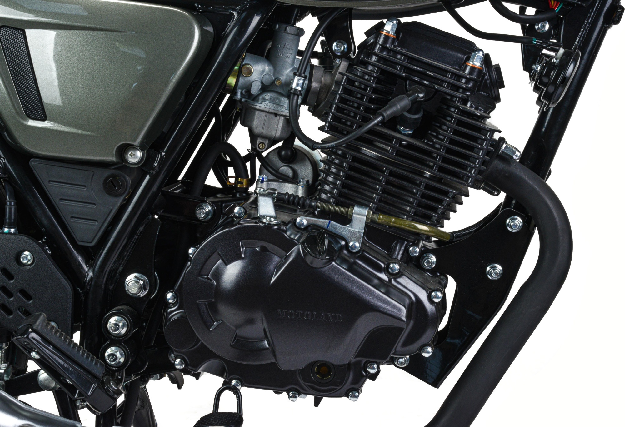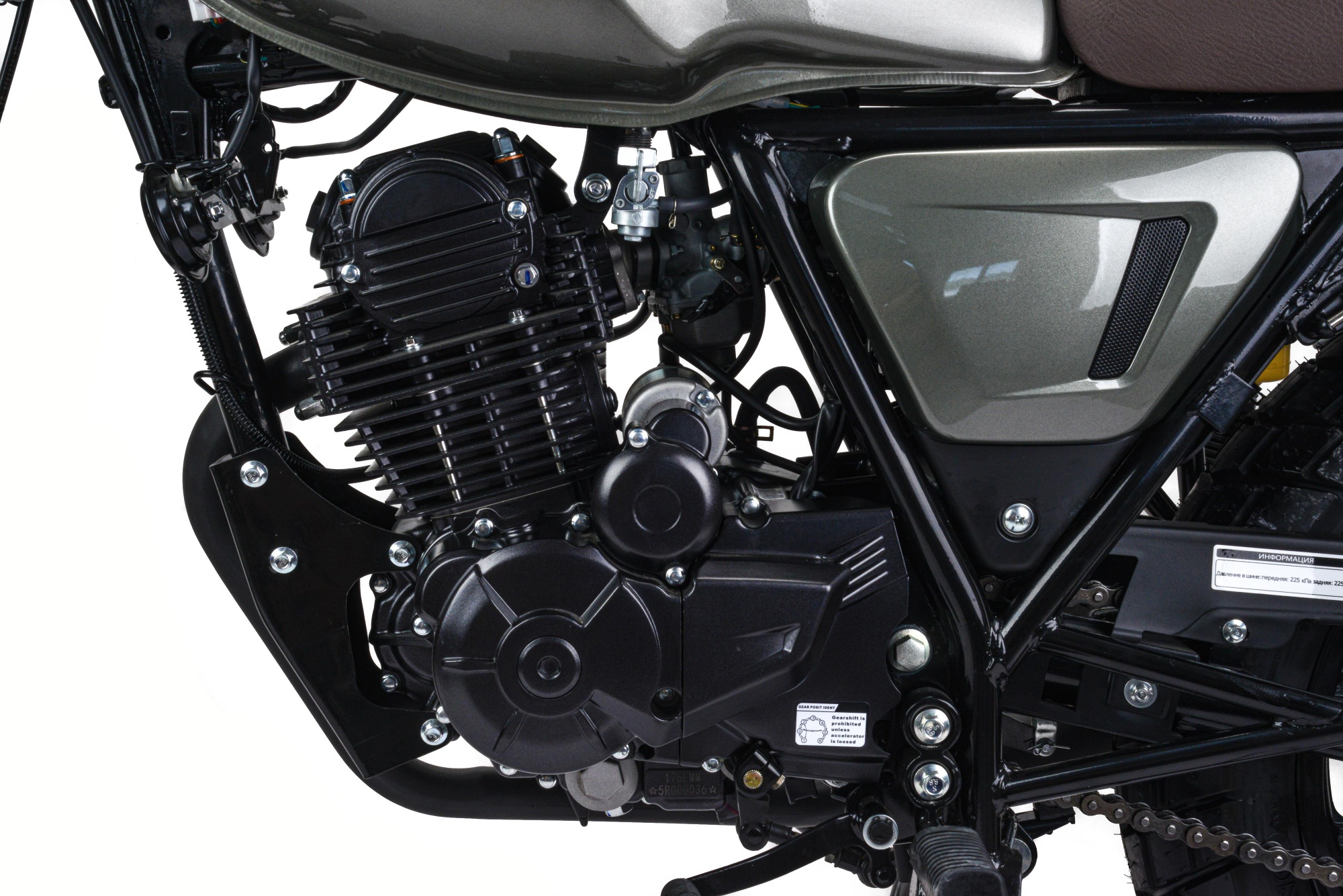 Мотоцикл оснащен двигателем 300 куб.см 175FMN (баланс. вал) с 6 ступенчатой коробкой передач, мощностью 25 л.с. Установлена защита цепи, усиленный толстостенный руль и усиленная 520 цепь.