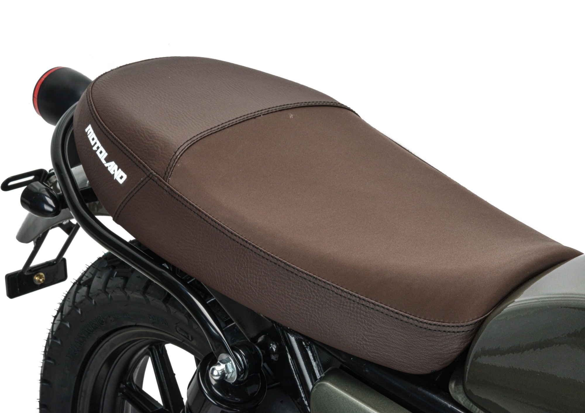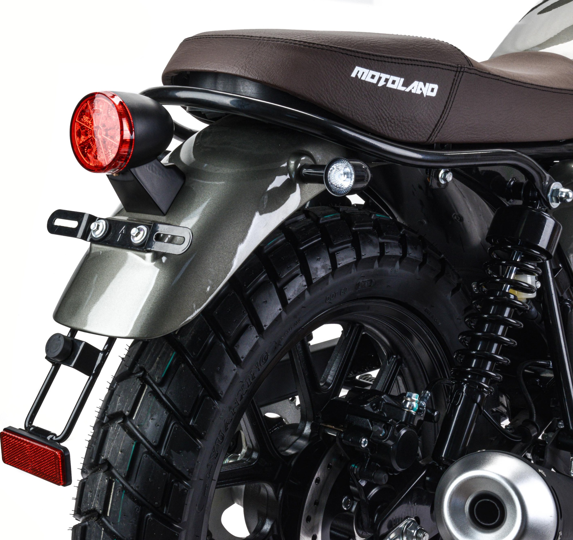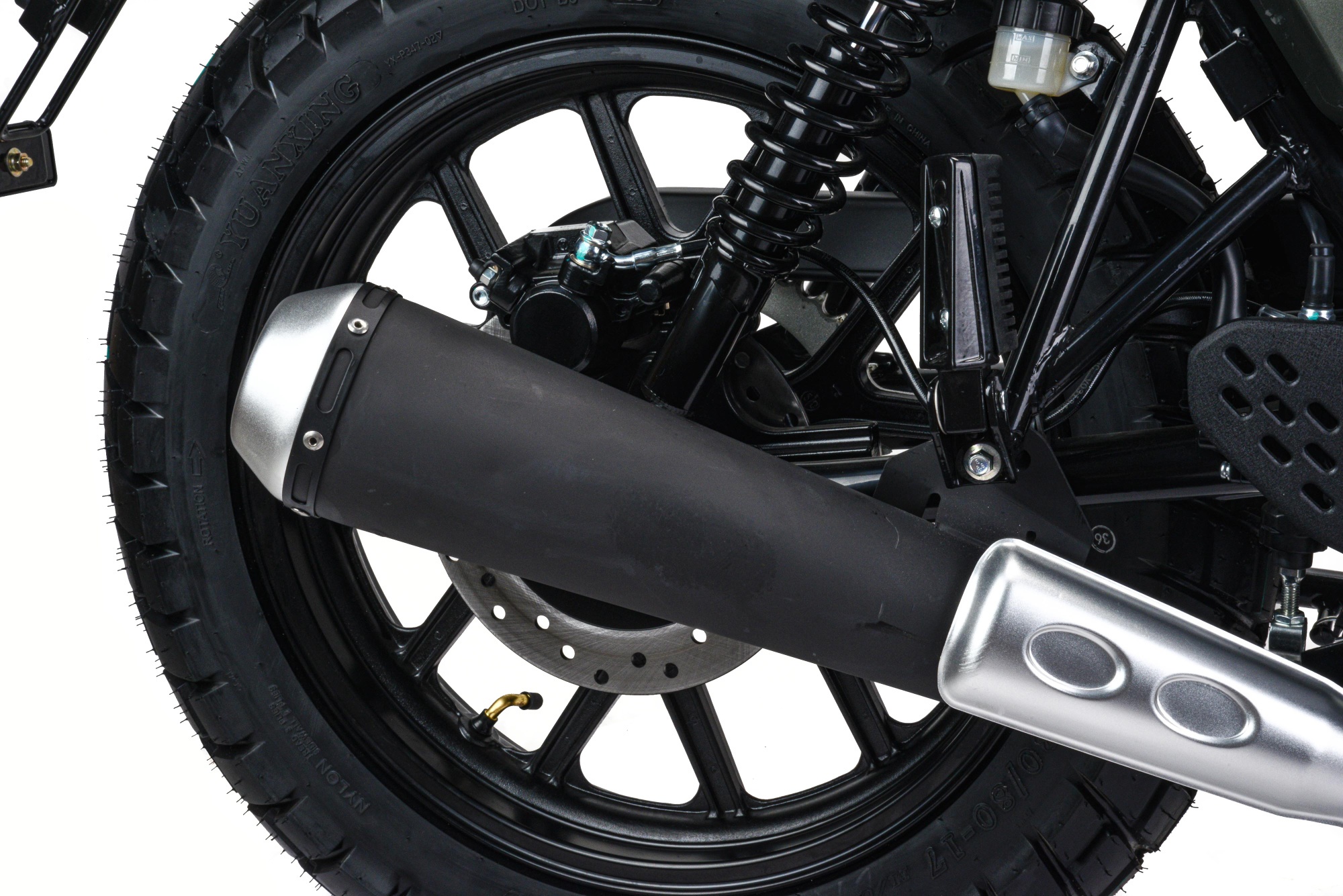 Покрышки 110/90-R17 130/80 R-17 с универсальным рисунком протектора установлены на прочных алюминиевых ободах. Такое сочетание позволяет быть уверенным в хорошем сцеплении с дорогой.