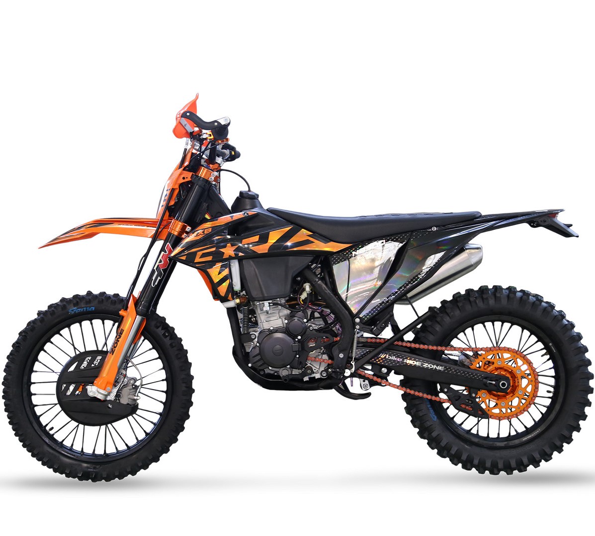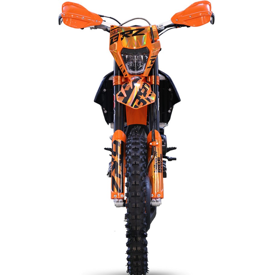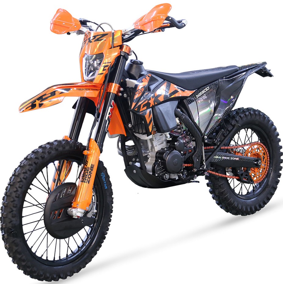 Мощный, тяговитый, надежный - всё это про 174 мотор с "косой головой". MX8 NB300 23 традиционно получил хорошую комплектацию - полностью регулируемая вилка и задний моноамортизатор MNT, крепкие обода Unison, фрезерованные ступицы, руль переменного сечения 28мм, алюминиевые фрезерованные траверсы, алюминиевые подножки водителя и лапки КПП, защита тормозного диска, защита рычагов нового образца (не проворачивается при падении), боковая защита рамы, алюминиевая ведомая звезда CNC, 520 цепь, приборная панель, счетчик моточасов и многое другое.