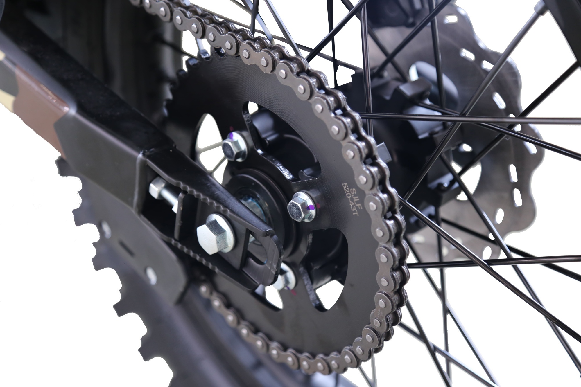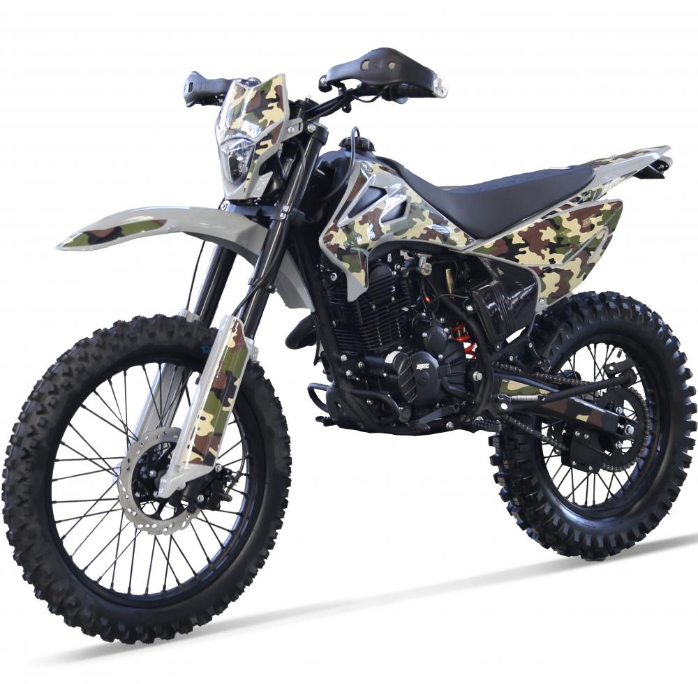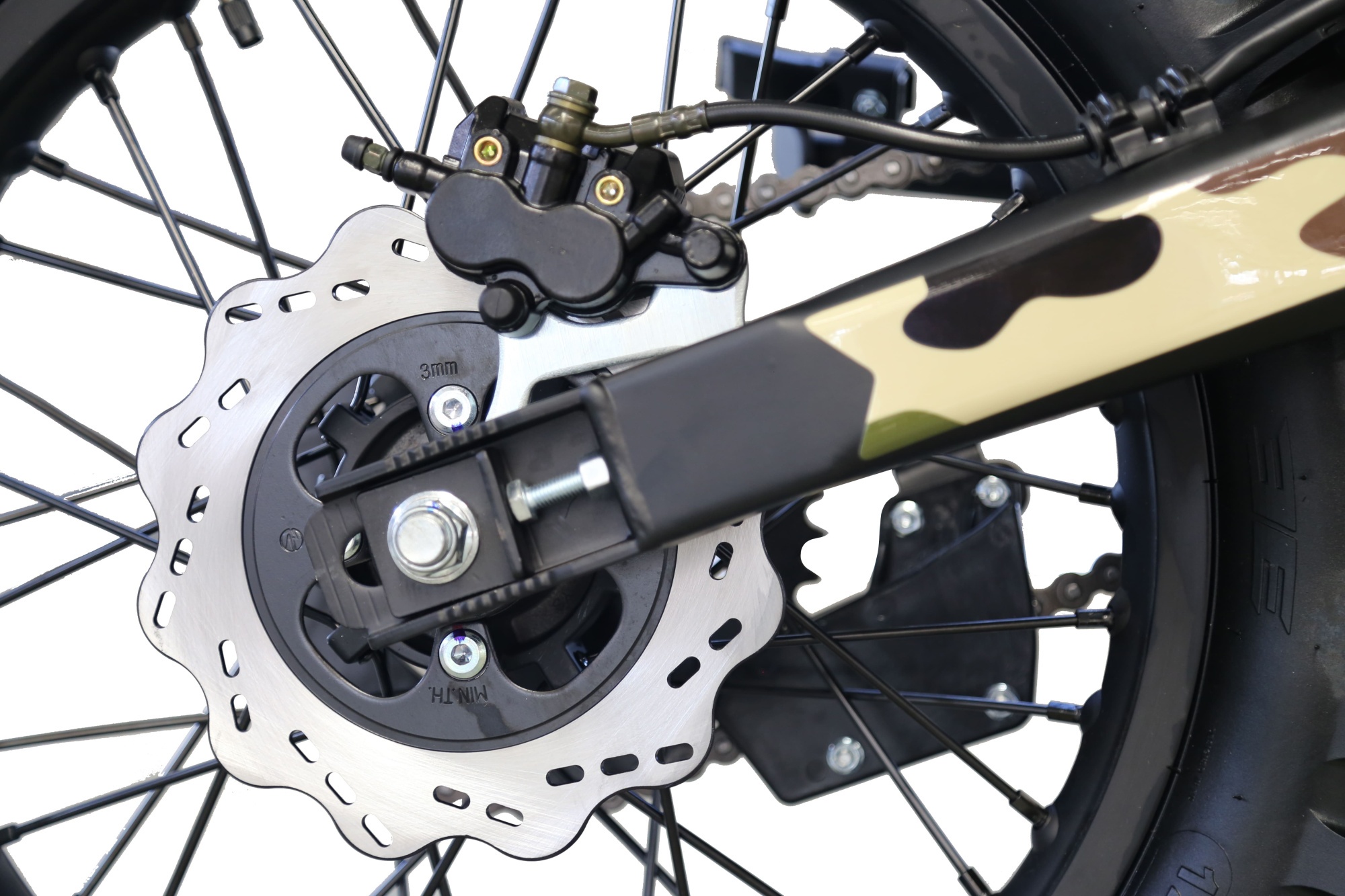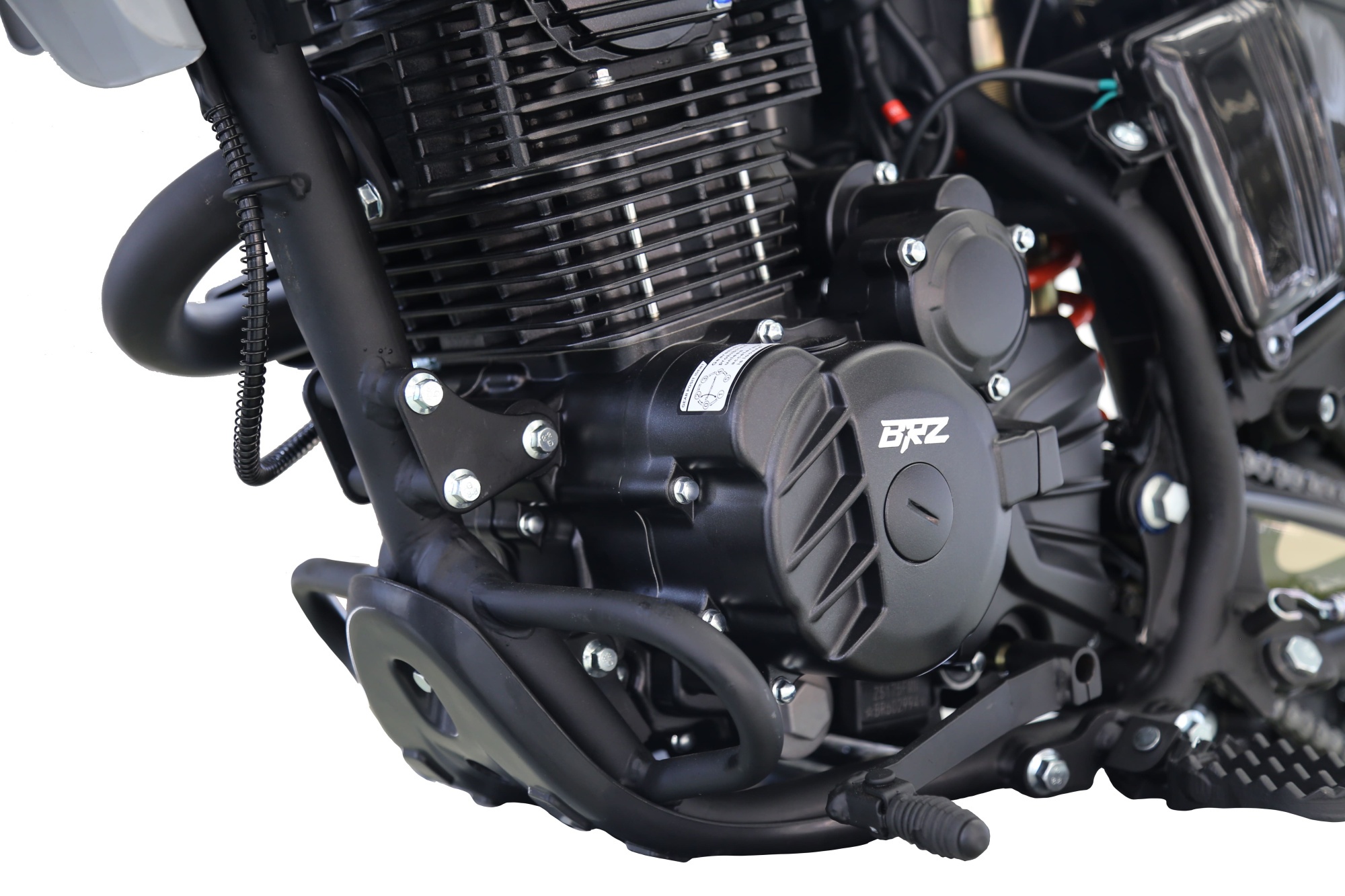 BRZ Z7 CB300F оснащен колесами размером 21" спереди и 18" сзади, что обеспечивает отличное сцепление и проходимость. Руль диаметром 28 мм и защита рук добавляют удобства при управлении, а цепь 520 КМС, багажник и подножки второго пассажира делают мотоцикл более универсальным.